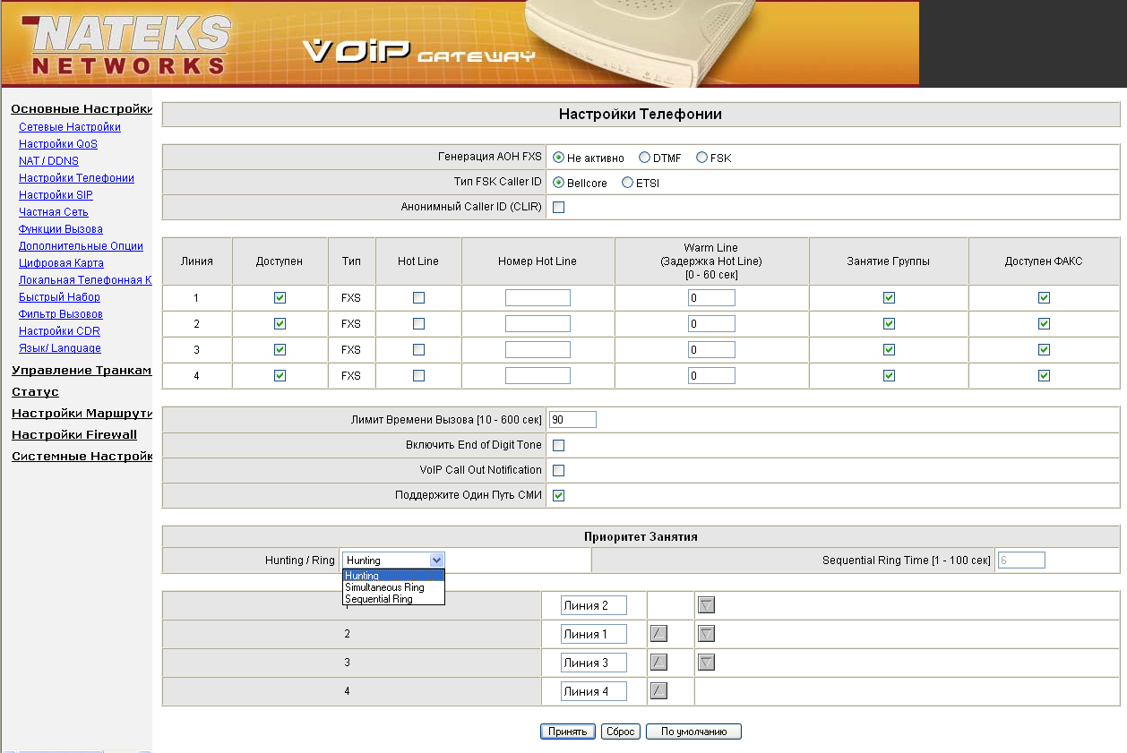 VoIP шлюз может помимо номеров на каждую линию иметь свой собственный номер. Если произвести вызов по этому номеру, то по умолчанию будет вызываться абонент на 1-й линии. Если 1-я линия занята — на 2-й линии, если 2-я занята — на 3-й и т.д. Приоритет вызова каждой линии устанавливается в настройках (рис. 3). Также возможно обзванивать каждую линию по очереди в случае, если истек заданный интервал времени, а трубку никто не поднял.