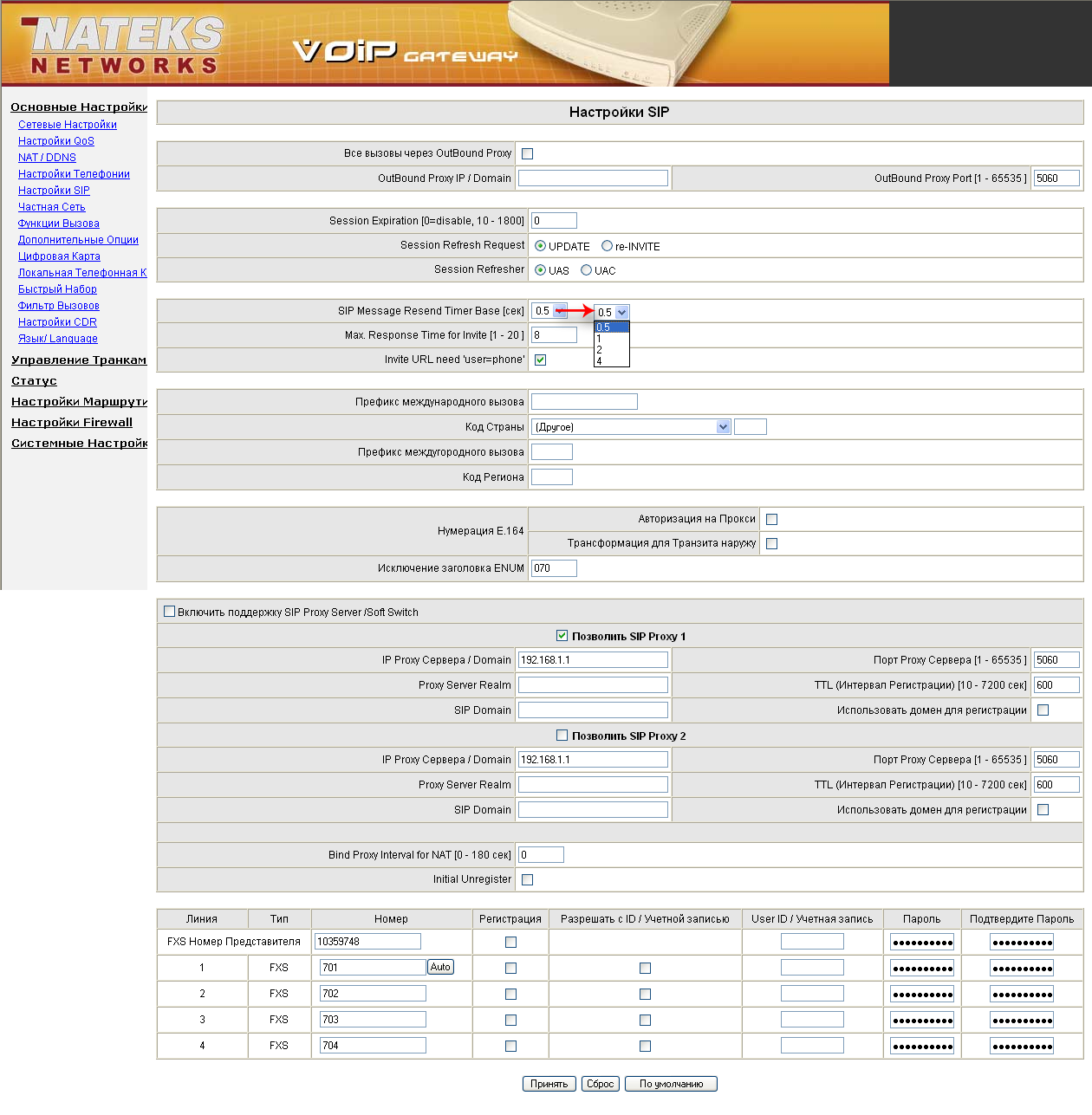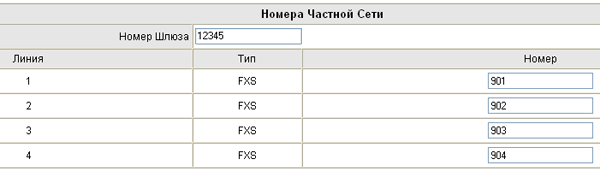Далее задаются внутренние номера телефонов и номер самого шлюза