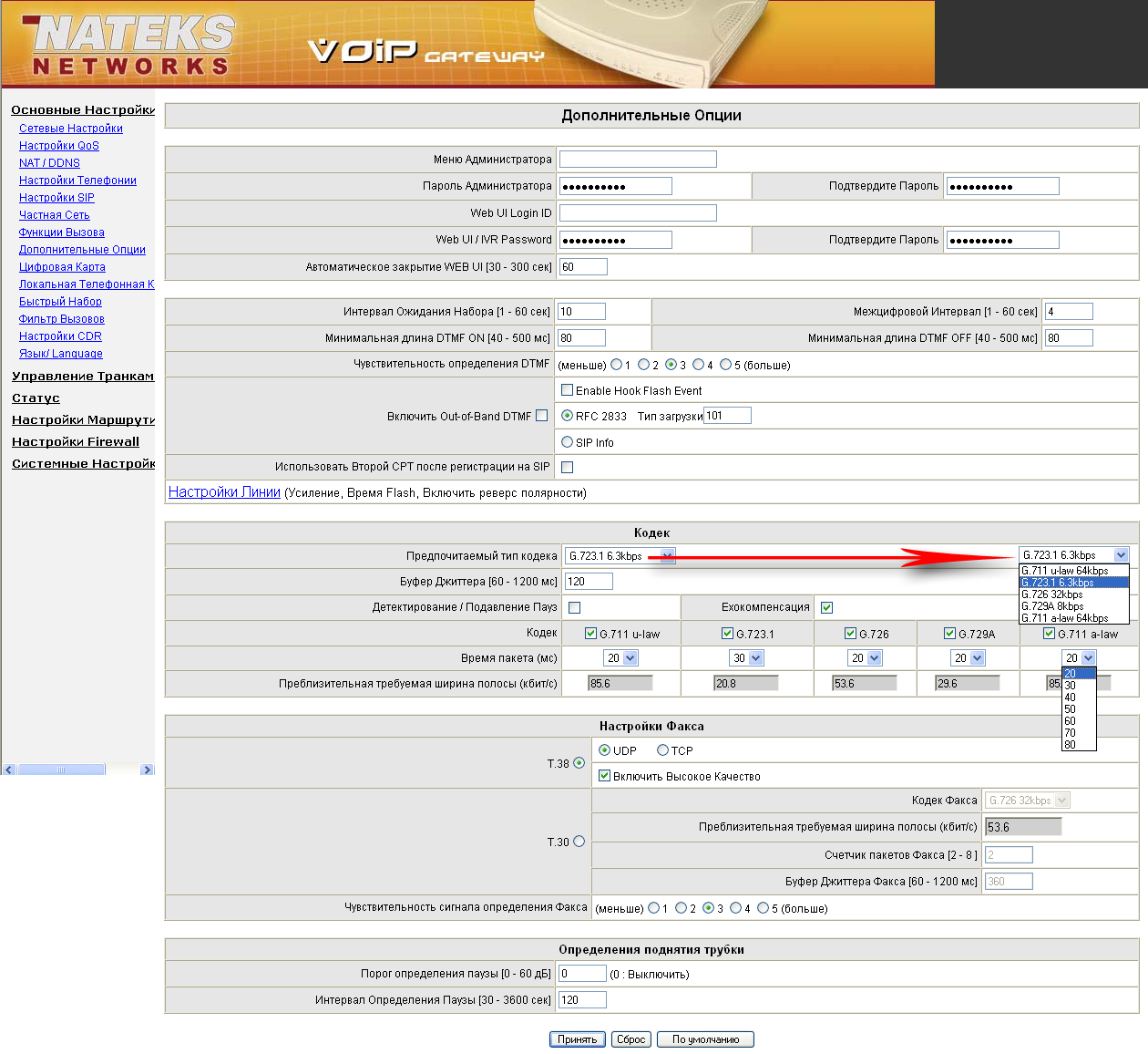 Здесь задается предпочитаемый кодек, параметр буфера джиттера, а также время пакета.