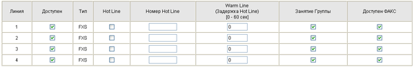 Для каждого подключенного телефона возможно также задание Hot Line номера — номера, который будет набран после снятия трубки. Можно также задать задержку — то есть через сколько секунд после снятия трубки будет набран Hot Line номер, если абонент не набрал номер телефона самостоятельно (это что-то наподобие связи с оператором). Также возможно запретить или разрешить использование факса.