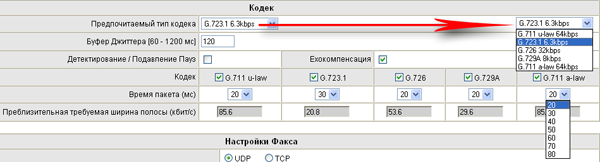 При настройке параметров используемых кодеков, показывается ориентировочная ширина полосы пропускания, которая требуется для беспроблемной работы IP-телефонии с использованием данного кодека. Во всех тестах, проблемы со связью возникали примерно на этой ширине полосы пропускания.