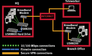 Встроенный в USR8200 VPN сервер поддерживает протоколы IPSec (tunnel и transport modes, с использованием DES/3DES шифрования) и PPTP, причем последний, как в режиме сервера, так и в режиме клиента. Кроме того, поддерживается пропуск соответствующих сессий (pass-through) сквозь маршрутизатор. Подобные возможности позволяют при помощи USR8200 строить распределенные сети, соединяя между собой их отдельные части посредством шифрованных туннелей (проходящих через Интернет). Например, можно связать несколько удаленных офисов в единую локальную сеть или подключить удаленных пользователей (работающих дома или находящихся в командировке) к локальной сети компании.