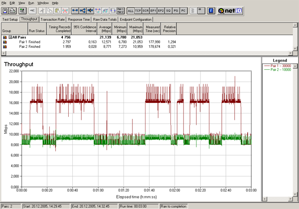 Поток, скорость которого в параметрах шейпинга была установлена в 10000 кбит/с, работал как раз на заданной скорости, а поток, скорость которого была установлена в 30000 кбит/с, — показывал значительно более низкую скорость (около 16 Мбит/с) и при этом график скорости сильно варьировался. Уже по первому графику видно, что шейпинг трафика работает, но также видно, что результаты его работы сильно отличаются от заданных в параметрах устройства.
