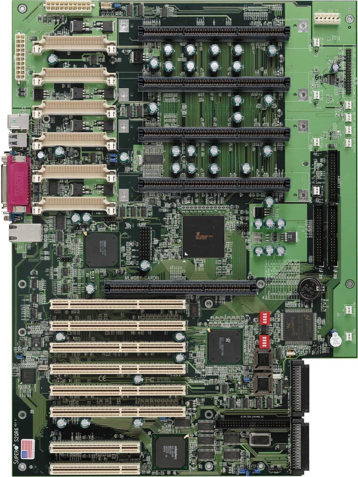 Материнская плата S2QR6 посторена на чипсете ServerWorks ServerSet III HE. Размеры ее внушительны — 18"×13", не даром для нее требуется такой корпус, как SC850. Эта материнская плата поддерживает до 4-х процессоров Pentium III Xeon (Slot2) 400–700MHz, только 100MHz FSВ (сейчас доступны версии на 500, 550 и 700MHz). Процессоры можно установить в количестве от 1 до 4-х. При этом неиспользуемые Slot2 необходимо закрыть специальными заглушками. Заметим, что несмотря на то, что этот чипсет сделан не Intel, на платформе прекрасно работают ОС Windows 2000 и RedHat Linux, не требуя каких-либо драйверов и обновлений в том числе и для мультипроцессорности. Для надежности на двух главный микросхемах чипсета установлены радиаторы.