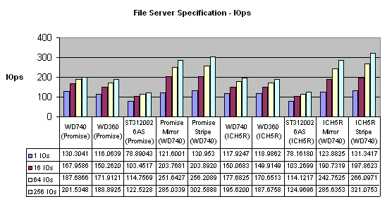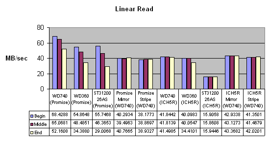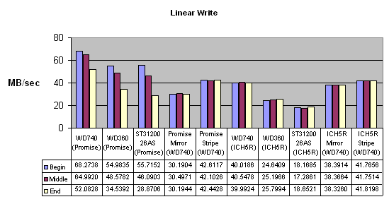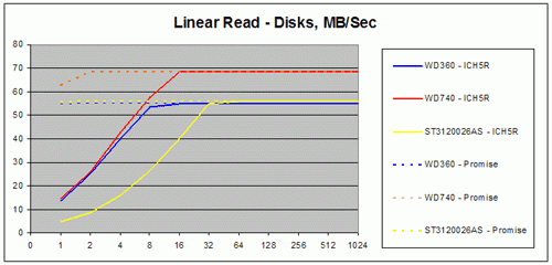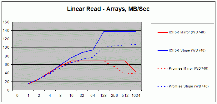 То есть в случае с отдельными дисками Promise даёт ровную производительность при любом размере блока. ICH5R набирает обороты только на 8-32 кб в зависимости от диска.