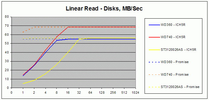 Теперь касательно планки в 40 МБ/сек на ICH5R для всех дисков и массивов, а так же массивов на Promise'е. Как мне кажется, у ICH5R производительность ограничена «считалкой», которая лимитирует IOPs. Что лимитирует промайз мне неясно. Для разгадки этого феномена я провел ряд дополнительных тестов, суть которых состояла в варьировании блока чтения (чтение начала диска).