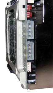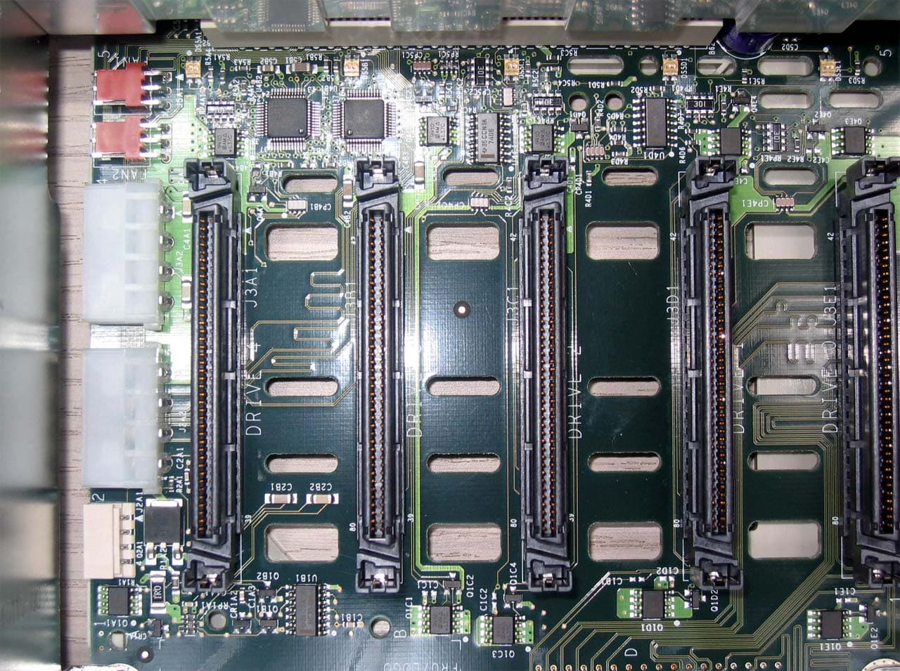 Но в SATA варианте можно подключить только 4 диска (!) — место пятого занимает заглушка, и разъём не разведён на плате. Сделано это ввиду того, что как раз на месте пятого разъёма распаяны коннекторы SATA.