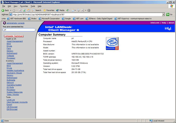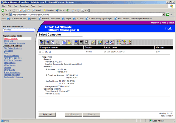 Плата поддерживает удалённый мониторинг — LanDesk. Но ввиду того, что материнская плата и корпус всё-таки из разных классов, осуществляется мониторинг только 4-х вентиляторов (включая процессорный), а корпус имеет 5 вентиляторов + 1 на процессоре. Более того, один вентилятор пришлось подключать через переходник к БП — для него не осталось коннектора на плате.