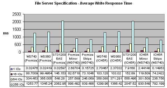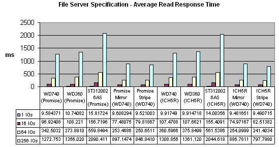 Ещё один очень интересный тест — фактически, при одном потоке, это среднее время доступа. Варьируя в Access specification параметр %reads, получаем либо среднее время доступа на чтение, либо на запись. Тестировать в несколько потоков смысла нет, фактически, результаты будут пропорциональны тесту File Server. Так что чисто теоретически интересен лишь тест в один поток. Опять же при записи играет роль кэш.
