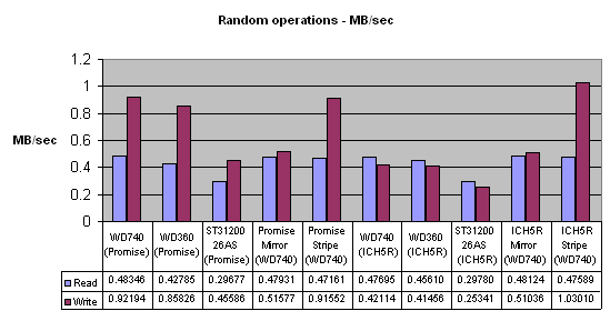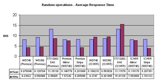Опять же странные результаты для массивов. Ещё раз повторюсь, что в конце по этому поводу я скажу пару слов. И убийственный результат Seagate'а на ICH5R. Замечу по результатам других статей — это нормальная производительность этого диска (см. статью по сравнению дисков с интерфейсом Serial ATA).