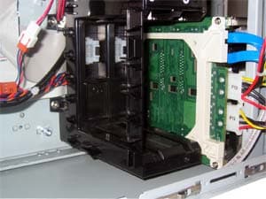 Так как в нашей конфигурации нет scsi-дисков, то мы её выкрутили. После недолгого раздумья и внешнего осмотра зародилась одна мысль. Надо сказать, что основа у обеих корзин одинаковая, различаются они только печатной платой находящейся на дне корзины. К корзине прикручены широкие салазки для крепления в корпусе, вот они-то и дали толчок мысли.