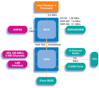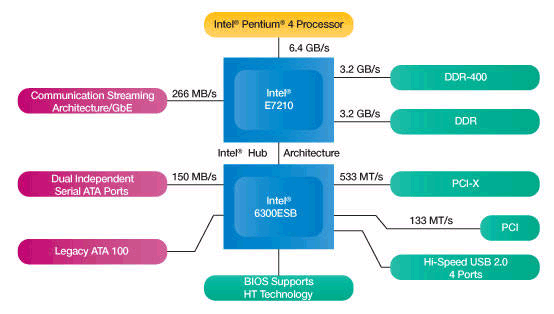 Современные чипсеты Intel условно можно разделить на серверные и десктопные. В серверных чипсетах шины ввода-вывода PCI-X напрямую соединены с MCH (Memory Controller Hub), в десктопных это всегда делается через южный мост (ICH-I/O controller HUB). В чипсетах для серверов начального уровня (E7210, 875P) гигабитный адаптер Ethernet напрямую подключен к MCH, чтобы сбалансировать нагрузку и разгрузить ICH.