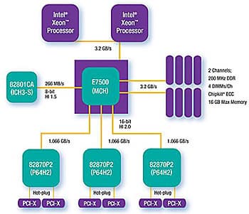 | E7500 | Xeon | 400 | PCI, PCI-X | DDR 200 ECC Registered |