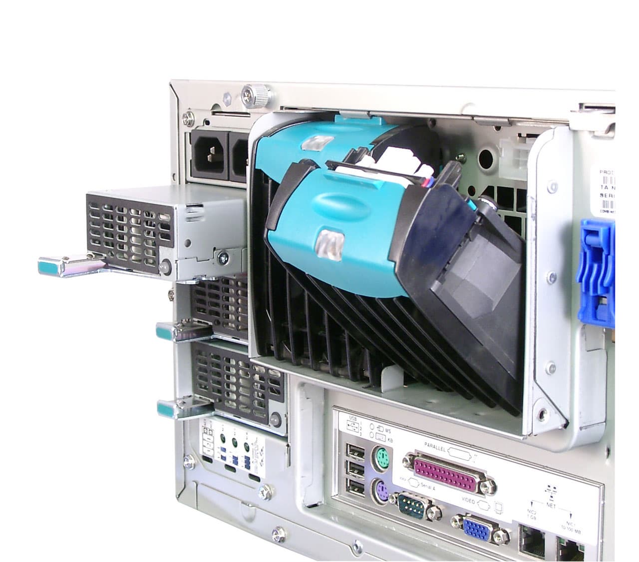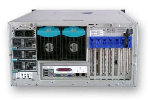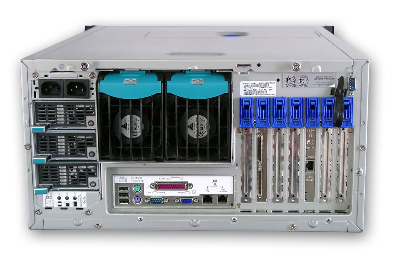 Сзади корпуса расположены три блока питания (два из них работают в режиме распределенной нагрузки, а третий является резервным). Все три БП являются hotswap-овыми, т.е. могут заменяться во время работы сервера. Правее видны два hotswap вентилятора, на наружной стенке. Ниже расположена панель разъемов последовательного, параллельного и USB портов, а так же PS/2 разъемы под клавиатуру и мышь. Тут же находятся два сетевых разъема. А далее идут слоты под платы расширения, два из которых заняты SCSI-контроллером и третьим сетевым (гигабитным) адаптером.