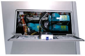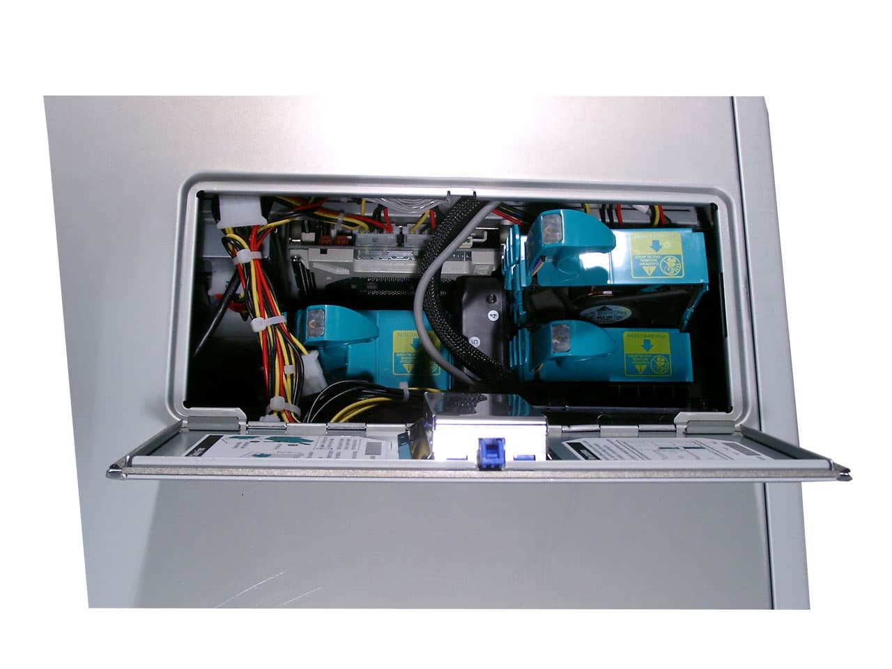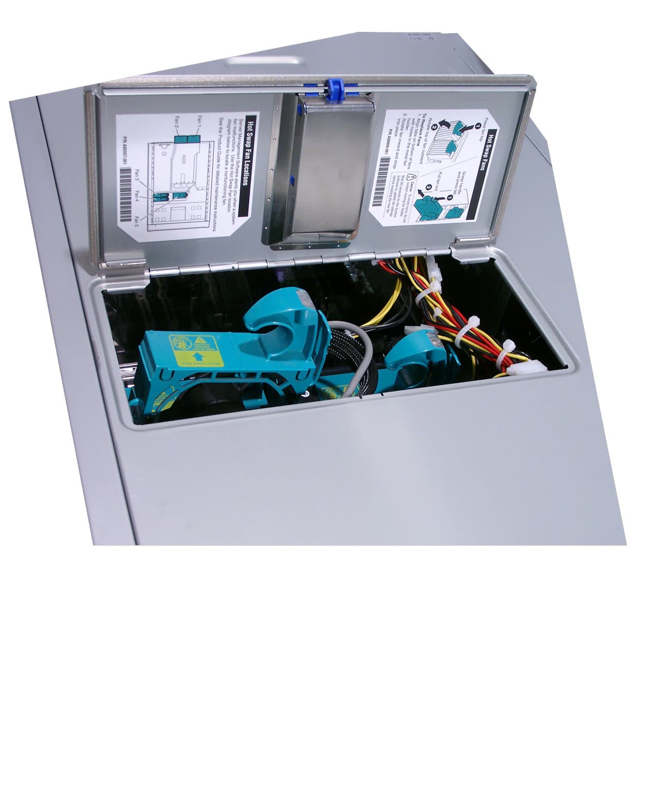 Что же касается горячей замены внутрикорпусных вентиляторов, то для этого не нужно снимать верхнюю крышку с корпуса. В ней предусмотрена специальная дверца как раз для этих целей.