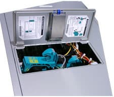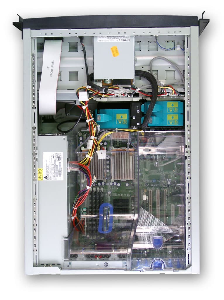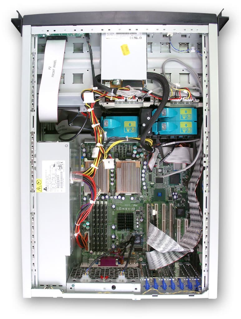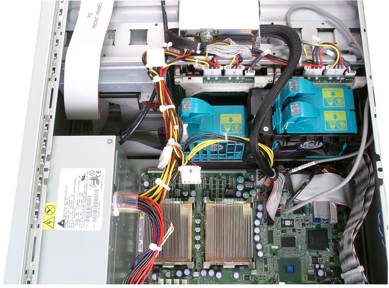 Два пластиковых кожуха, установленных внутри корпуса, формируют две воздушных струи (создаваемых двумя группами вентиляторов), одна из которых охлаждает процессоры (на них установлены лишь пассивные радиаторы), вторая — платы расширения. Оба внешних вентилятора (расположенных на задней стенке), работают на вытяжку воздуха из кожуха, установленного над процессорами.