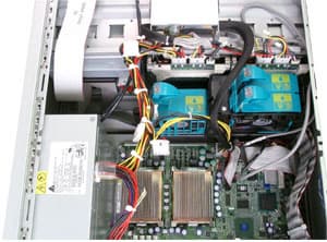 Не считая блоков питания, внутри корпуса расположено три вентилятора, плюс еще два (вытяжных) — на задней стенке. Точнее, вентиляторов на один больше — в центральном находятся два вентилятора, физически объединенных в один корпус, тем не менее, будем рассматривать его за один. Все они обладают функцией горячей замены.