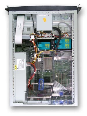 На переднюю (контрольную) панель сервера выведены три кнопки (Power, Reset, Sleep), пять индикаторов (LAN #1,#2 activity, HDD activity, Power, Status), а так же разъем USB порта. Рядом с панелью установлен 3.5“ дисковод, ниже – CD-ROM и еще два отсека под пятидюймовые устройства. А всю остальную площадь занимают две корзины, каждая из которых рассчитана на 5 hot-swap Ultra320 SCSI дисков.