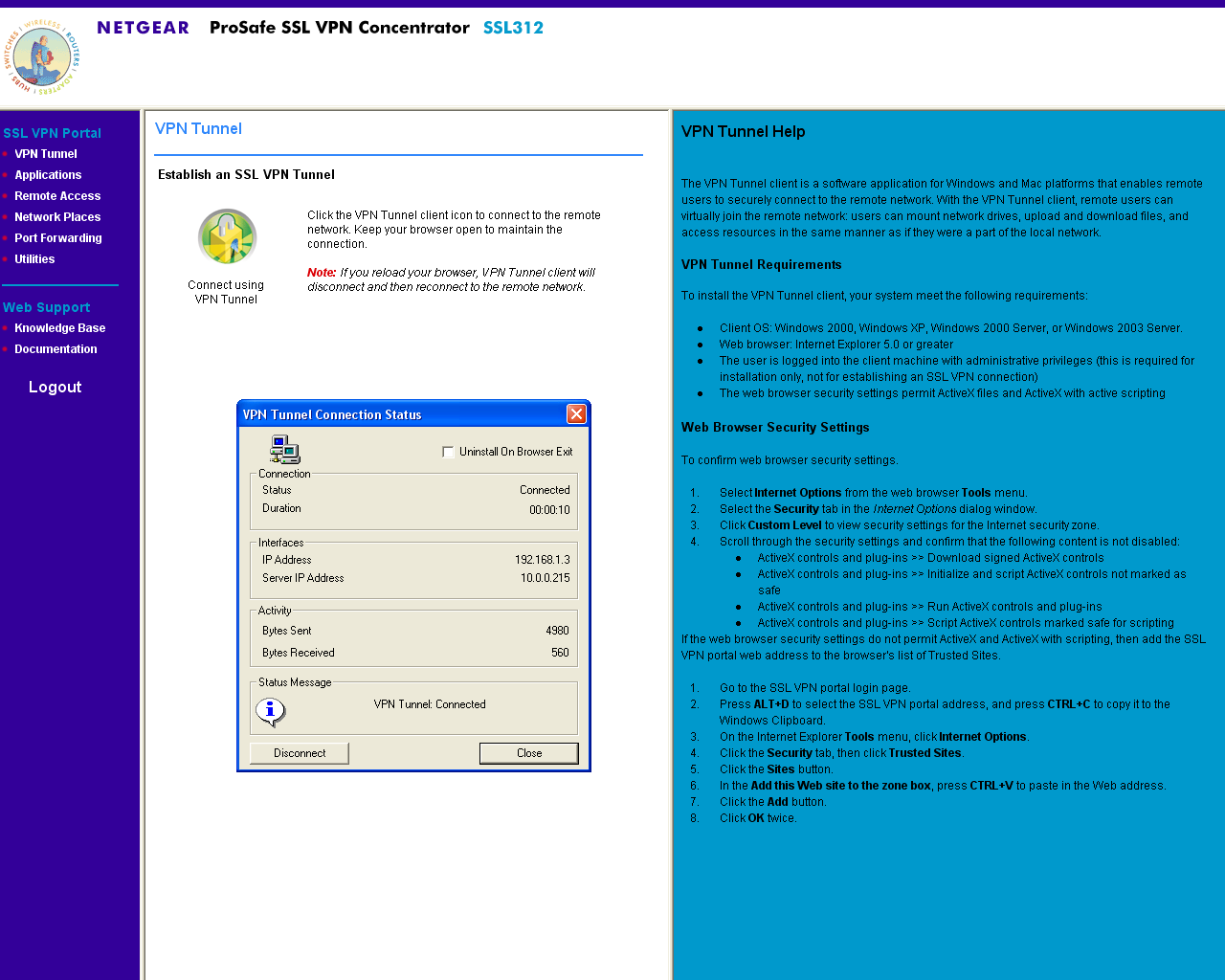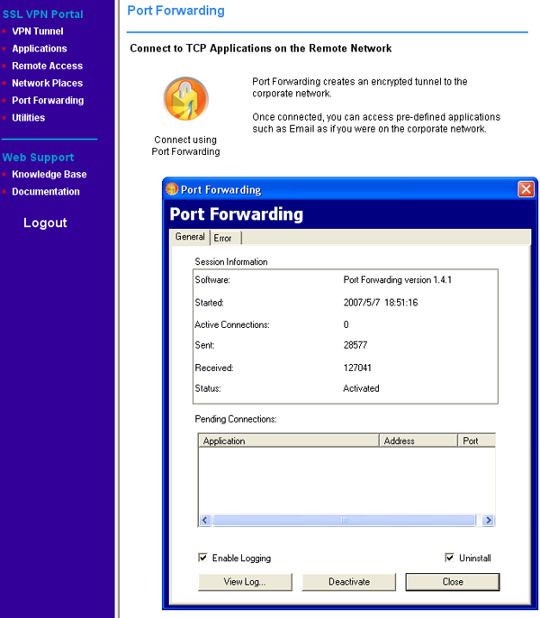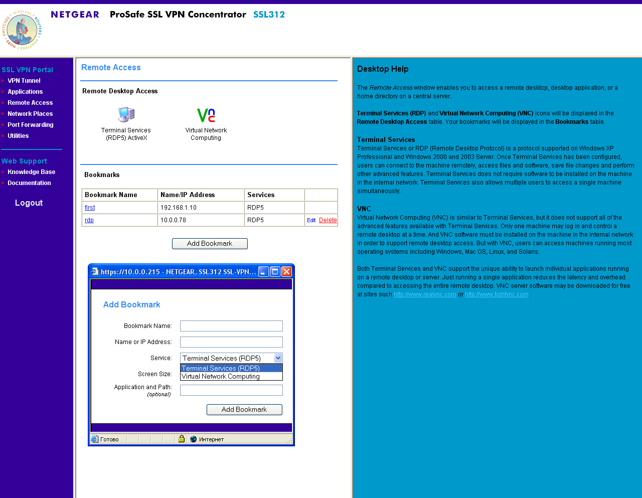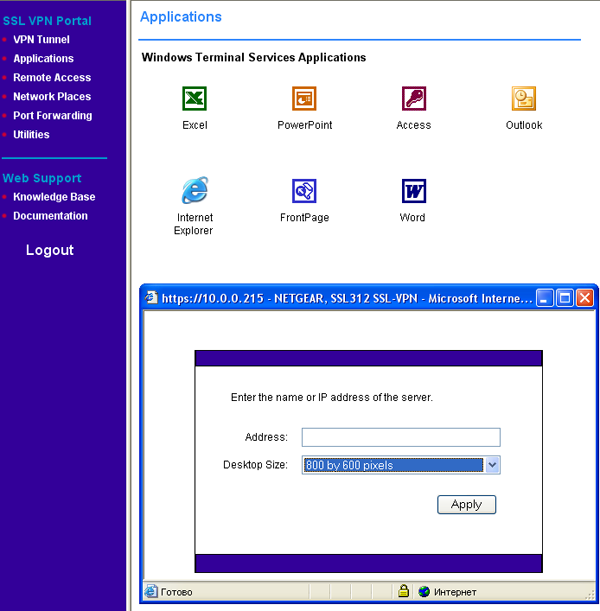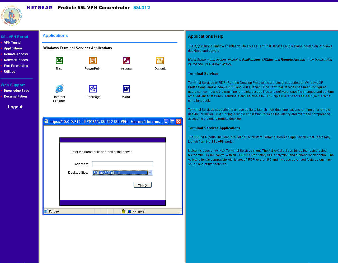 Устройство предназначено для предоставления возможности удаленного доступа к приватной сети предприятия, при этом не требуется дополнительного программного обеспечения — все манипуляции производятся через ActiveX — компоненты, которые могут быть загружены и установлены непосредственно с устройства, что, однако предъявляет дополнительные требования к системе: Windows (XP, 2000, 2003), Internet Explorer 5.0 или выше, в браузере должны быть установлены настройки, разрешающие использование компонентов ActiveX, клиент должен иметь доступ в систему с привилегиями администратора для установки соответствующих ActiveX-компонентов (компоненты ActiveX требуют разовой установки, последующее их использование не требует привилегий администратора), а также может потребоваться установка некоторых отдельных обновлений Windows (для работы с Удаленным рабочим столом — RDP, нам потребовалось загрузить на клиентской (!) машине определенное обновление) — адрес обновления был сообщен интерфейсом настройки.