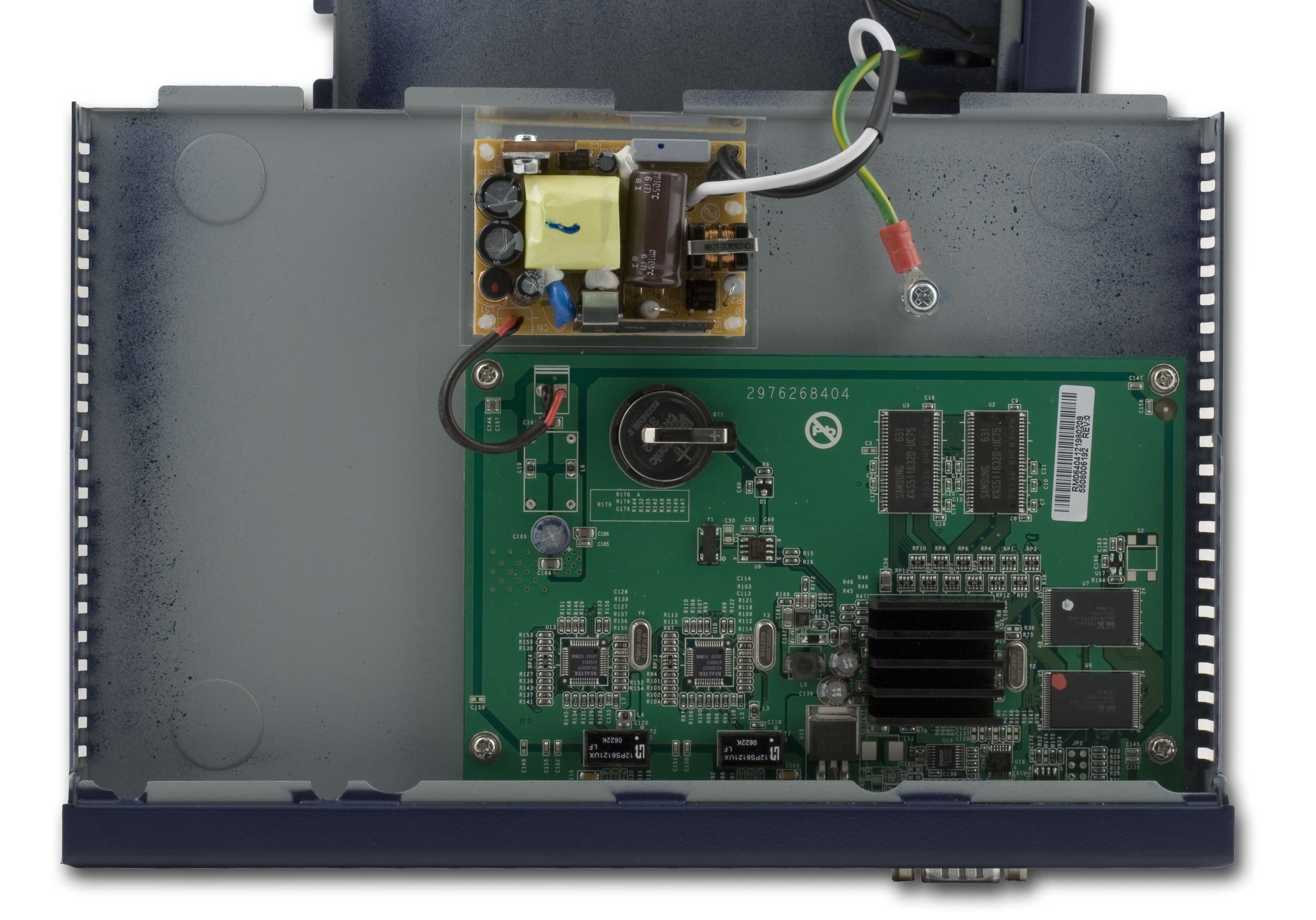 Процессор устройства скрыт под радиатором, приклеенным настолько крепко, что была вероятность снять его вместе с процессором. На плате установлено 128 Мбайт SDRAM-памяти (2 × Samsung K4S511632D) и 16 Мбайт Flash-памяти (2 × Macronix MX29LV640BTTC). Ethernet-интерфейсы организованы на базе микросхем Realtek RTL8201CP.