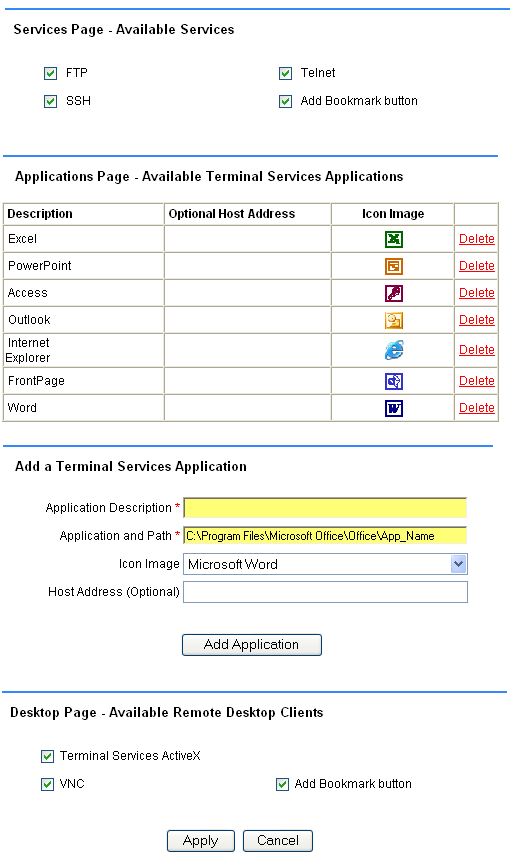 Здесь задается список и параметры приложений — данные приложения могут запускаться при подключении к удаленному рабочему столу по протоколу RDP — при подключении к удаленному рабочему столу сразу запускается необходимое приложение, при закрытии приложения удаленный сеанс закрывается. В портале по-умолчанию (данный портал имеет название "SSL-VPN") "забито" несколько офисных приложений, но при этом неправильно указаны пути, по которым это приложение вызывается.