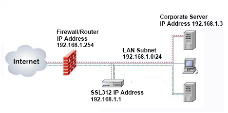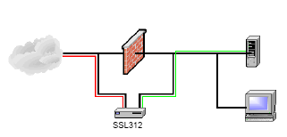 Другой вариант использования задействует оба Ethernet порта SSL312, при этом SSL-трафик не проходит через файрвол. При этом одному Ethernet-порту устройства назначается публичный IP-адрес, а второму — приватный IP-адрес внутренней сети. Для работы по данной схеме необходимо включить "Routing mode" на устройстве. SSL312 не выполняет функции NAT и файрвола и не заменяет их.