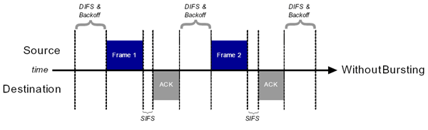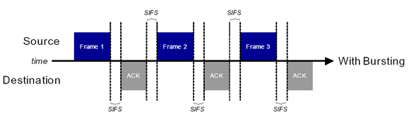 В этом режиме (рисунок 3), источник и получатель монопольно [по очереди] занимают канал под свою передачу. После передачи кадра frame1 и получения подтверждения об успешном приеме оного, передатчик не ждет положенный интервал времени DIFS. Передатчик выжидает лишь короткий временной интервал SIFS, после чего передает второй кадр данных и так далее. Тем самым, передатчик не дает возможности начать передачу другим станциям — им приходится ожидать окончания общего периода такой burst-передачи.