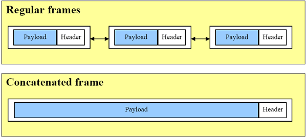 В технологию Frame Concatenation заложен алгоритм, позволяющий упаковывать в мега-кадры не все пакеты подряд. Например, если в очереди отправки на заданное направление находится лишь один кадр, то он будет отослан незамедлительно. Другими словами, сливаться будут лишь те кадры, у которых одинаковый адрес получателя (destination address, в данном случае имеется ввиду MAC адрес получателя). Причем, алгоритм действует только на unicast-пакеты — широковещательные (multicast), а так же служебные пакеты отсылаются без изменений.