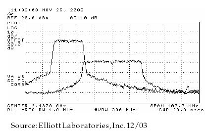 Из спектрограммы видно, что сигнал от Super G Turbo устройства ослаблен (стенами домов и расстоянием) на 30 дБ (то есть в 1000 раз). Такой помехой можно без проблем пренебречь, обычное 802.11g устройство будет функционировать в нормальном высокоскоростном режиме. А Super G точка доступа, в свою очередь, не будет переключаться в одноканальный режим работы.