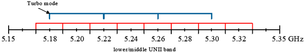 рис.1, турбо-каналы в нижней полосе частот UNII диапазона расположены на 5200, 5240 и 5280 МГц