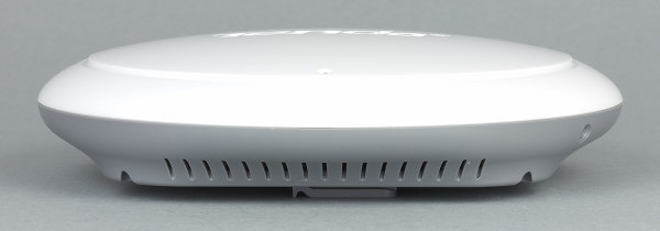 Вторая часть корпуса из серого матового пластика имеет по периметру решетки вентиляции. На ней находится и отверстие для скрытой кнопки сброса. Диаметр модели составляет 14,4 см, а высота с учетом подставки — около 4 см. Обратим внимание на отсутствие кнопки WPS, но учитывая варианты установки точки доступа, это не является серьезным упущением.