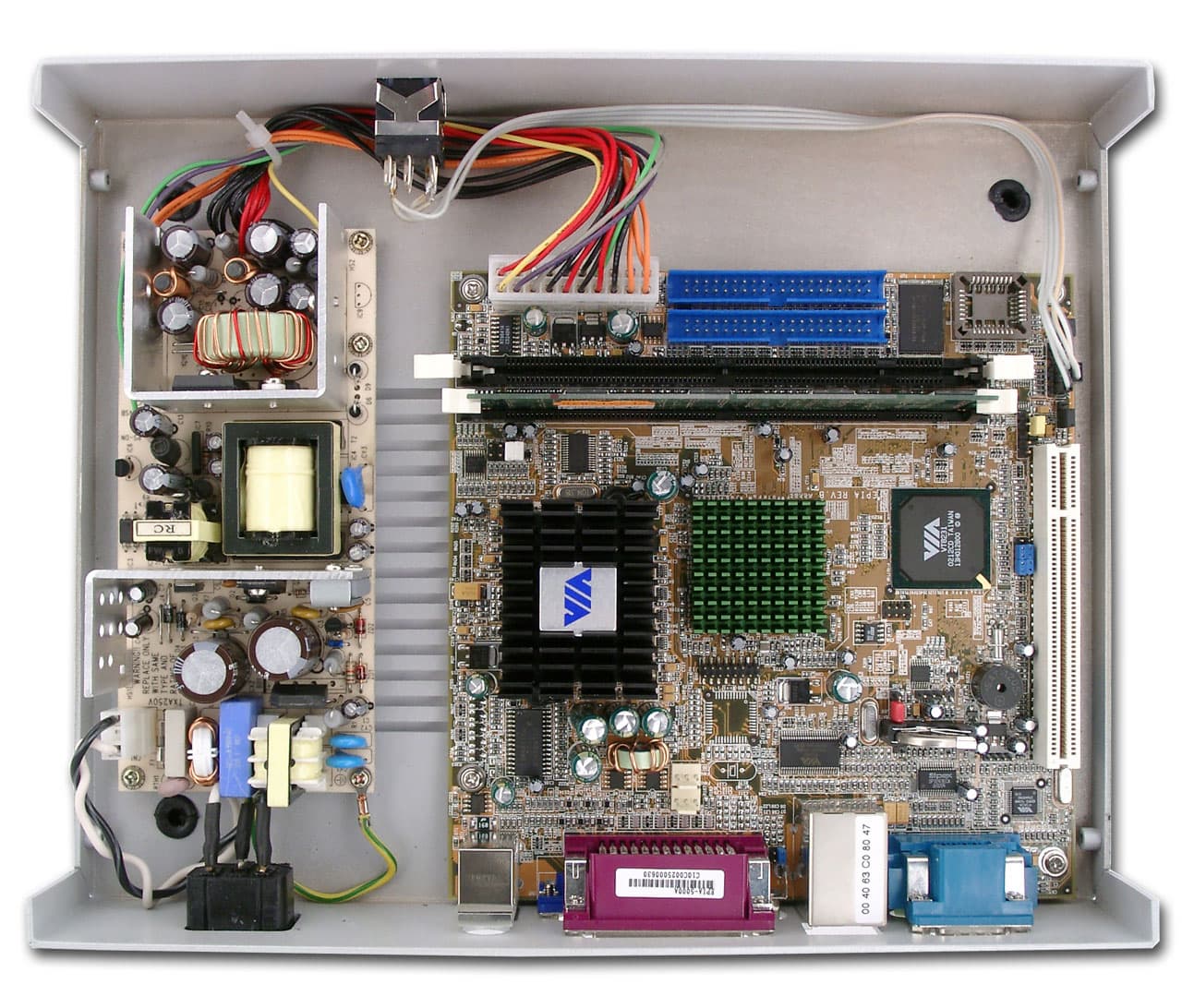 Все та же материнская плата VIA EPIA 5000 Mini-ITX, все тот же процессор VIA Eden ESP 5000 (частота 533 МГц), все тот же чипсет VIA PLE133 (северный мост VT8601 и южный мост VT8231). Встроенное видео AGP 2x Trident Blade 3D. Данной (на сегодняшний день устаревшей) конфигурации вполне хватает для решения задч, поставленных перед терминалом, ведь терминал только оттображает то, что происходит на удаленном сервере. При этом расходуются ресурсы того же удаленного сервера.