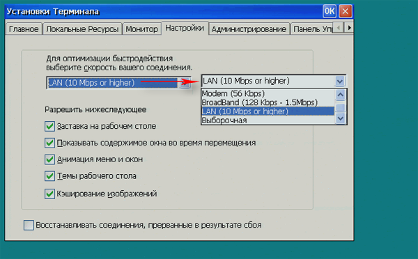 Здесь задаются параметры отображения — можно для увеличения скорости работы на медленном соединении уменьшить количество используемой графики. Во время тестирования терминала из нижеперечисленных возможностей была включена только возможность кэширования изображений.