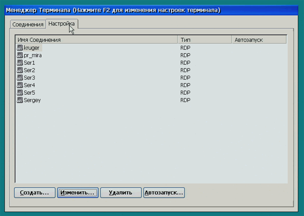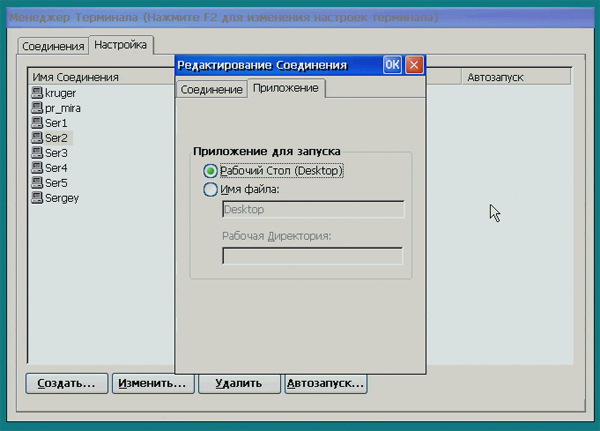 Здесь можно выбрать соединение, которое будет устанавливаться сразу после включения терминала