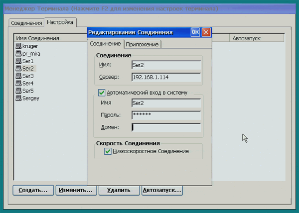 Для каждого соединения устанавливаются IP-адрес сервера, логин, пароль, имя домена. Если снять галочку "Автоматический вход в систему", то параметры придется вводить вручную.