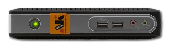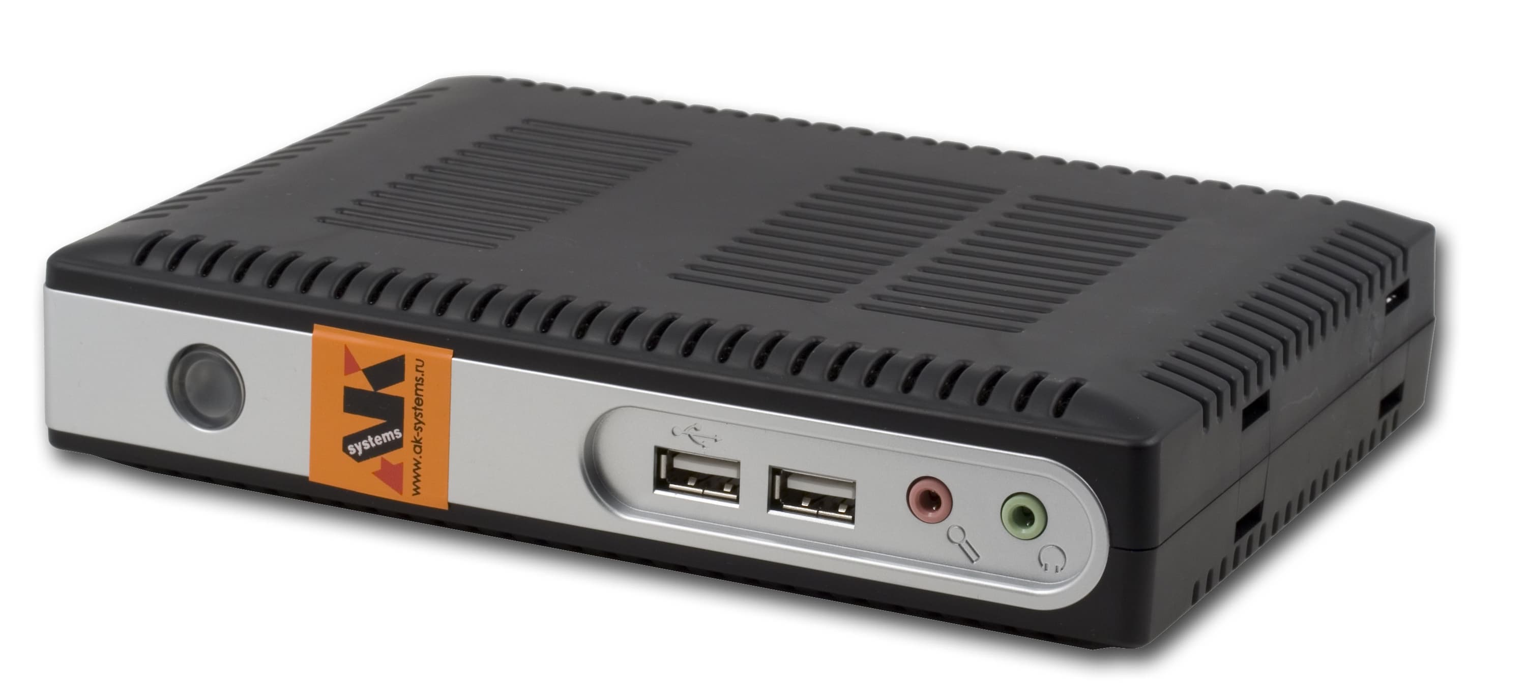 На передней панели терминального клиента AK-Systems расположена кнопка включения-выключения питания, два порта USB 2.0 и разъемы для подключения наушников и микрофона.