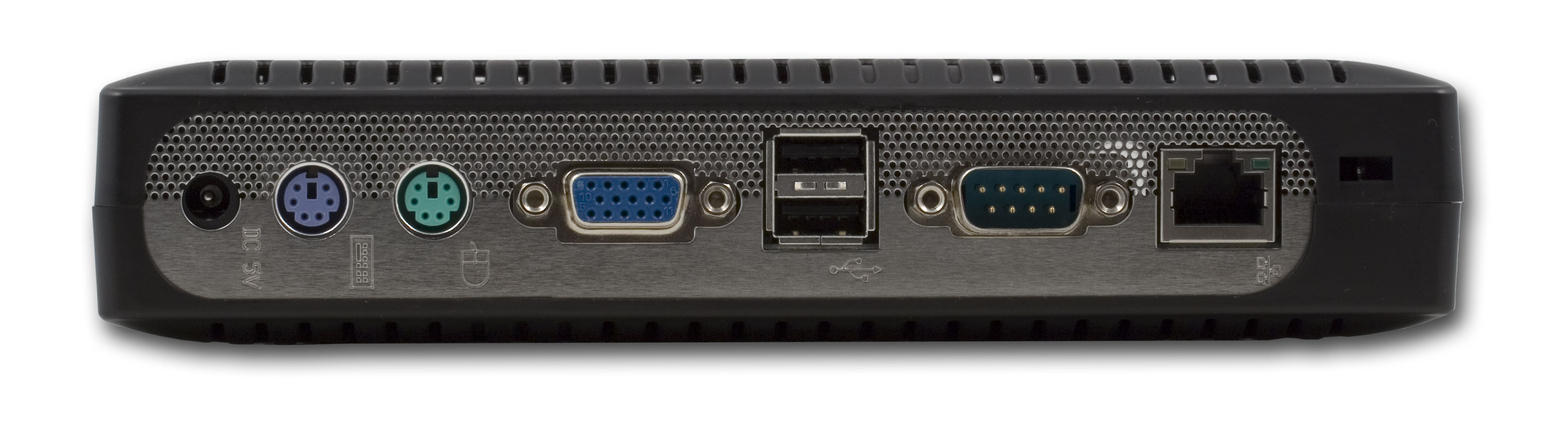 На задней панели расположены: разъем питания, разъемы KVM (для подключения клавиатуры — PS/2, мыши — PS/2 и монитора D-Sub), еще два порта USB 2.0, COM-порт и порт RJ-45 для подключения к сети.