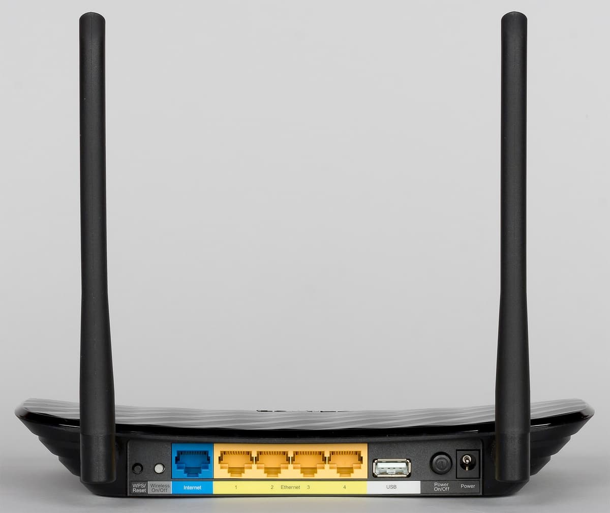 Все разъемы и кнопки расположены сзади. Здесь мы видим два разъема для антенн, пять гигабитных сетевых портов без индикаторов, вход для блока питания с выключателем, порт USB 2.0 и две кнопки — отключения Wi-Fi и установления связи по WPS/сброса настроек. Отметим, что расположены эти элементы достаточно плотно.