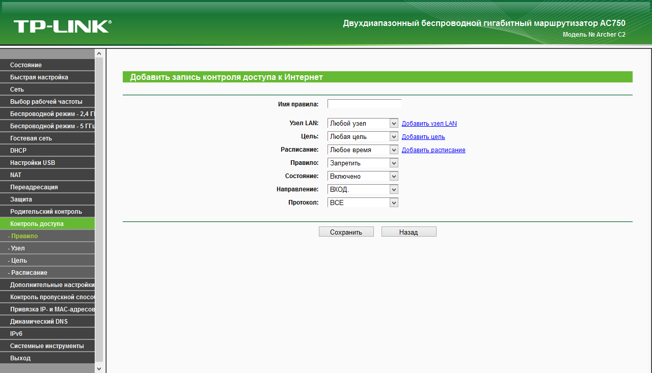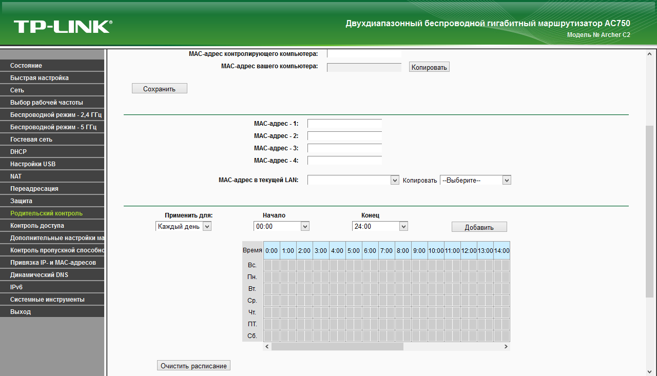 Функция «Родительский контроль» позволяет установить недельное расписание доступа к интернету для четырех клиентов локальной сети. Последние при этом выбираются по MAC-адресам.