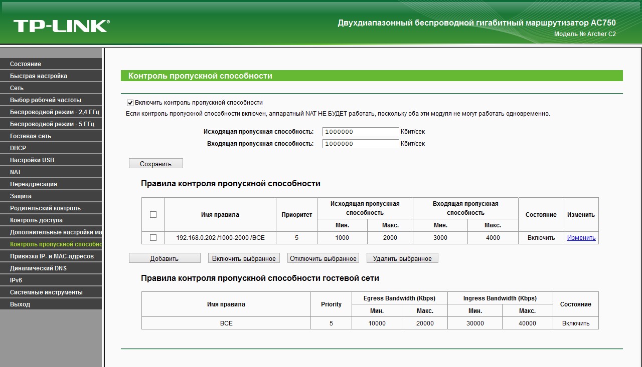 В прошивке устройства присутствует сервис контроля пропускной способности. Наиболее востребован он будет для установки ограничений клиентам гостевых беспроводных сетей. Но при необходимости вы можете запрограммировать и дополнительные правила для любых устройств по IP-адресам или диапазонам. Отметим, что включение данной функции отключает аппаратный NAT, и гигабитные скорости устройство обеспечить уже не может, но на массовых тарифах до 100 Мбит/с это практически не сказывается.