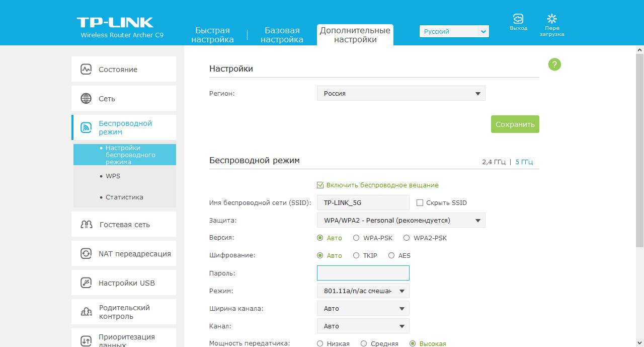 Основные параметры беспроводных точек доступа — регион, имя сети, режим, номер канала, и защита. Есть также регулировка мощности передатчика (три варианта) и поддержка WPS. На отдельной странице можно посмотреть список клиентов с указанием MAC-адресов и диапазона, но узнать скорость подключения или уровень сигнала здесь нельзя. Отметим, что в диапазоне 5 ГГц для региона Россия модель поддерживает каналы 36—48.