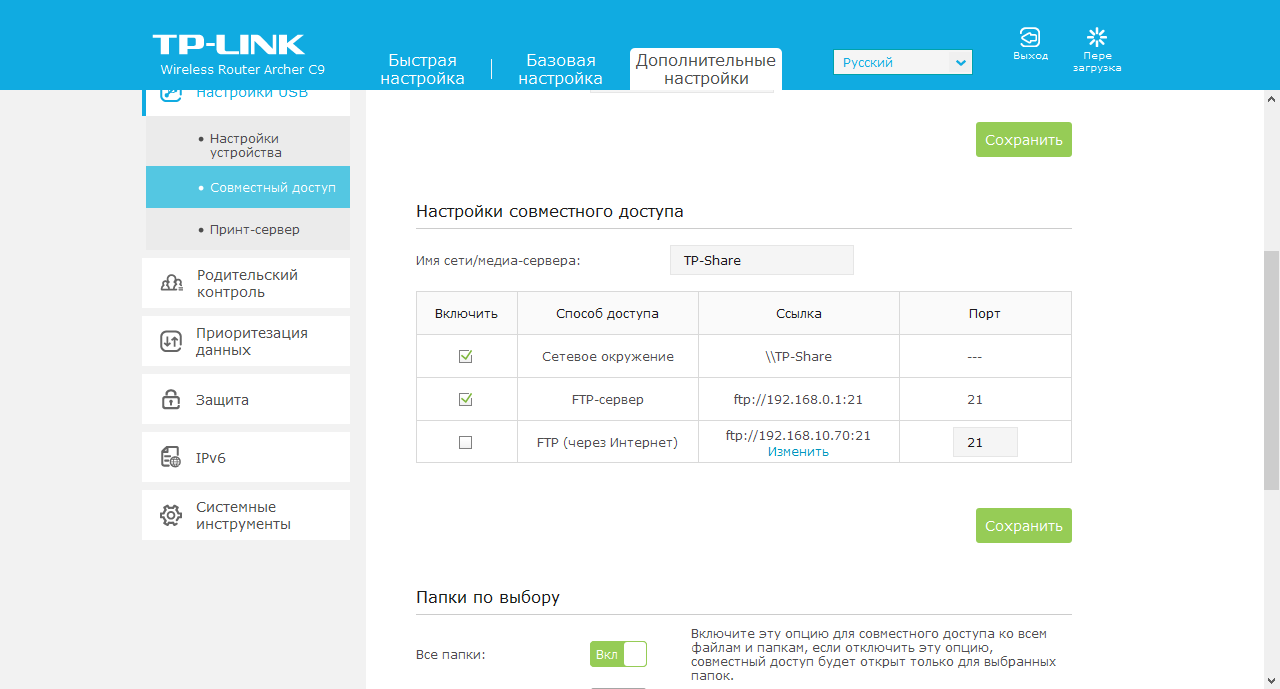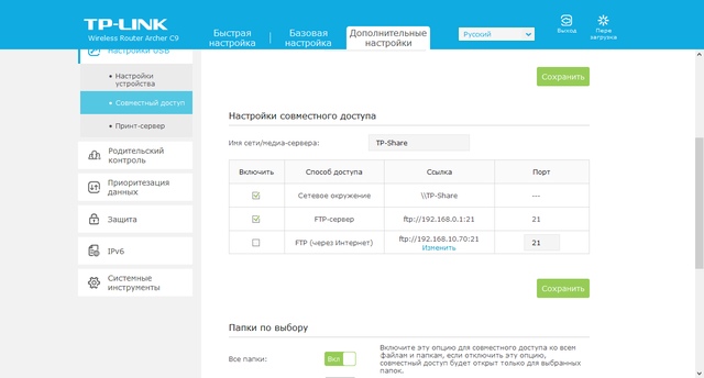 Также предусмотрено изменением некоторых параметров работы с внешними USB-устройствами. В частности, вы можете поменять сетевое имя, выбрать папки для сетевого доступа, установить права.