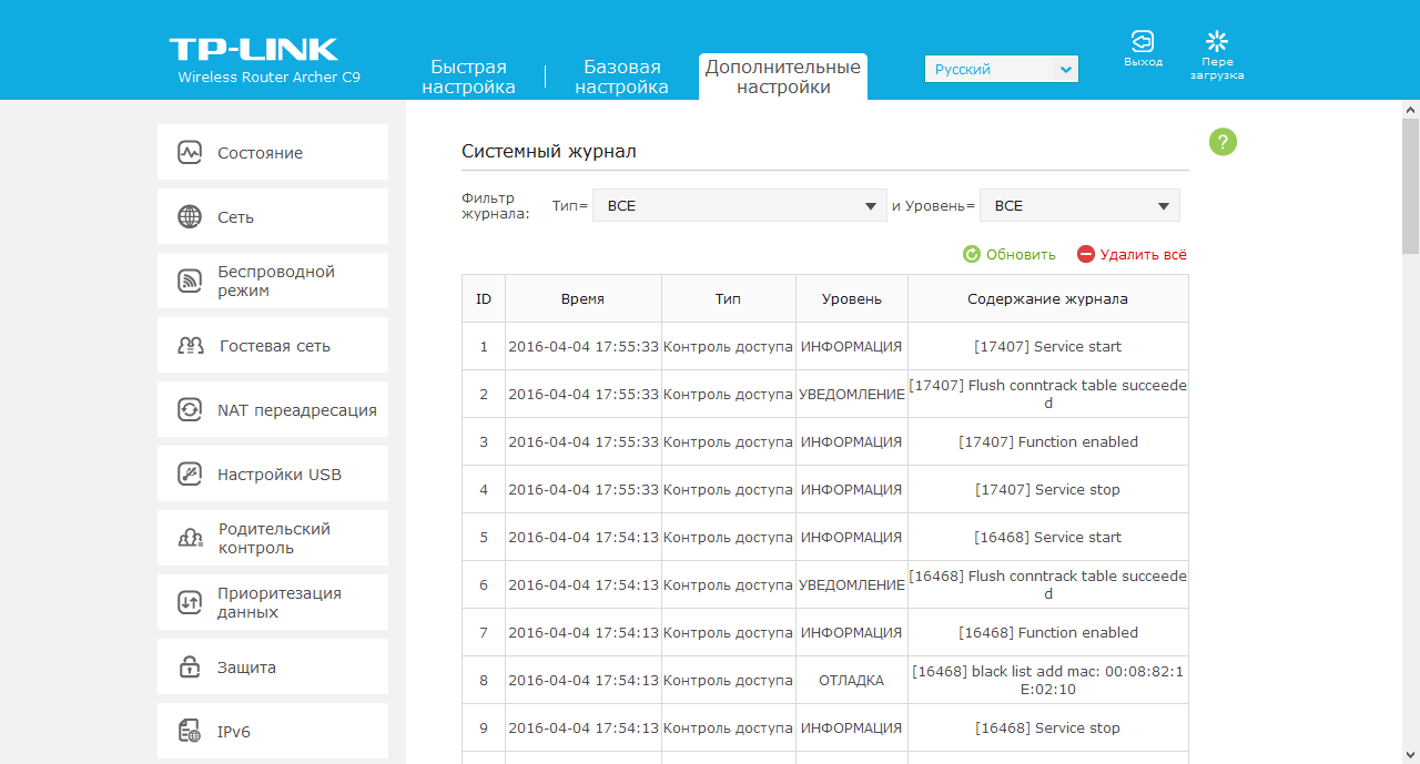 Системный журнал роутера может храниться в нем самом, скачиваться на компьютер и отправляться на электронную почту по расписанию. Во время просмотра списка событий предусмотрен выбор источника и уровня для более удобного поиска информации.