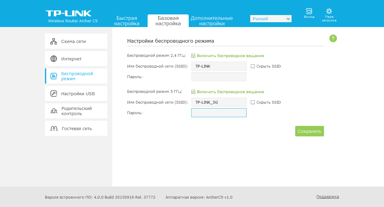 На странице «Беспроводной режим» приводятся основные параметры точек доступа — имя сети и пароль для каждого диапазона. Также здесь можно отключить вещание и активировать опцию скрытия SSID.