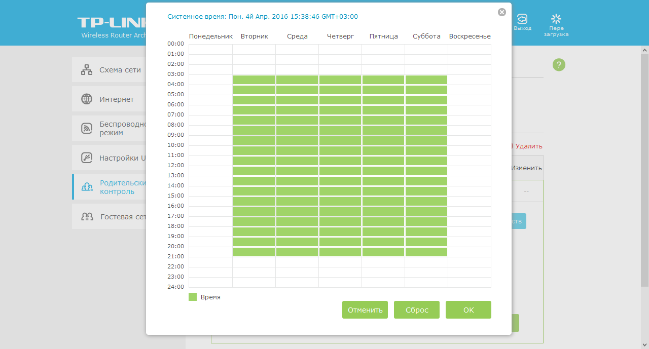 Функция родительского контроля позволяет запрограммировать недельное расписание доступа к интернету для клиентов с точностью до часа. При этом устройства выбираются по MAC-адресам.