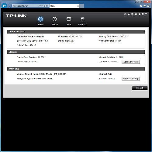 В настоящий момент он доступен только на английском языке, но это не должно быть проблемой. Упомянем наличие встроенной справочной системы, что сегодня встречается все чаще. В верхней части окна присутствует статусная строка со значками интерфейсов, карты памяти, батареи, SMS. При первом подключении к web-интерфейсу предлагается использовать помощника для проверки и установки основных параметров для подключения к мобильному оператору и организации беспроводной сети. Отметим, что индикатор уровня заряда батареи ведет себя неадекватно — показания у него очень нестабильные и ориентироваться на него не стоит. Лучше посмотреть на экран роутера.