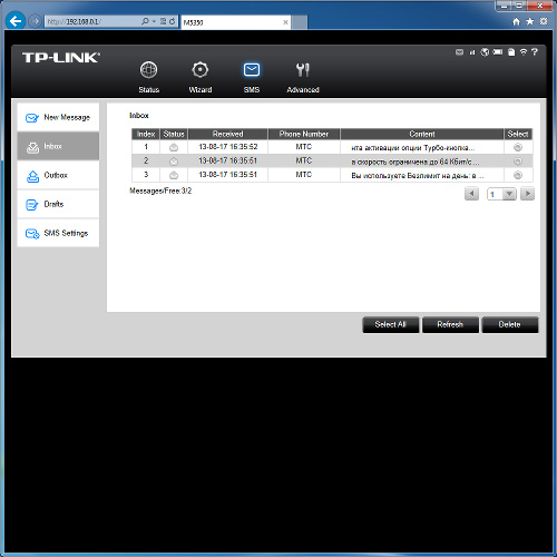 Присутствует возможность работы с SMS-сообщениями, что может быть полезно для изменения тарифных опций или других операций с SIM-картой. Отметим здесь поддержку русского языка. А вот работать с длинными сообщениями устройство не умеет. Для отправки можно использовать только стандартные 160 знаков, а при приеме сообщения с большим числом символов не «склеиваются» автоматически и представлены в виде нескольких записей во входящих. Помимо того, несколько странно выглядит объем этой папки, который еще и зависит от установленной карты. На одной нашей тестовой карте лимит был 5 сообщений, а на второй умещалось 15. Для рассматриваемого варианта автономного роутера это может быть проблемой, поскольку важная информация может просто потеряться. Похоже, что роутер использует исключительно SIM-карту и не имеет собственной памяти для сообщений.
