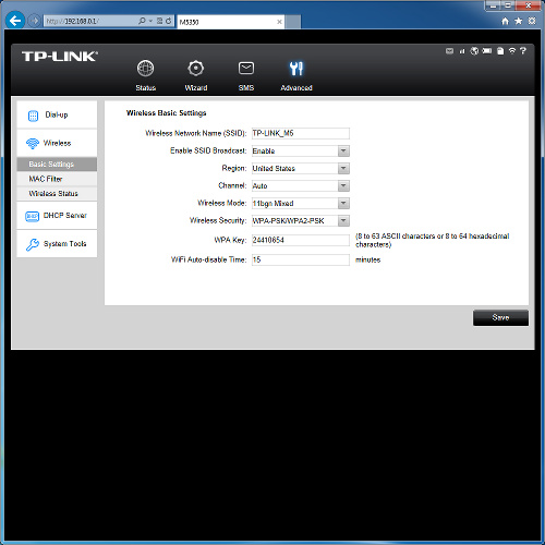 Набор настроек беспроводной сети стандартен: регион, имя сети, номер канала, режим, защита. Из полезных дополнений упомянем возможность отключения беспроводного модуля по тайм-ауту при отсутствии активных клиентов, что позволяет сэкономить заряд батареи. Присутствует фильтр MAC-адресов на 10 записей и страница со списком текущих клиентов с указанием их MAC-адресов.