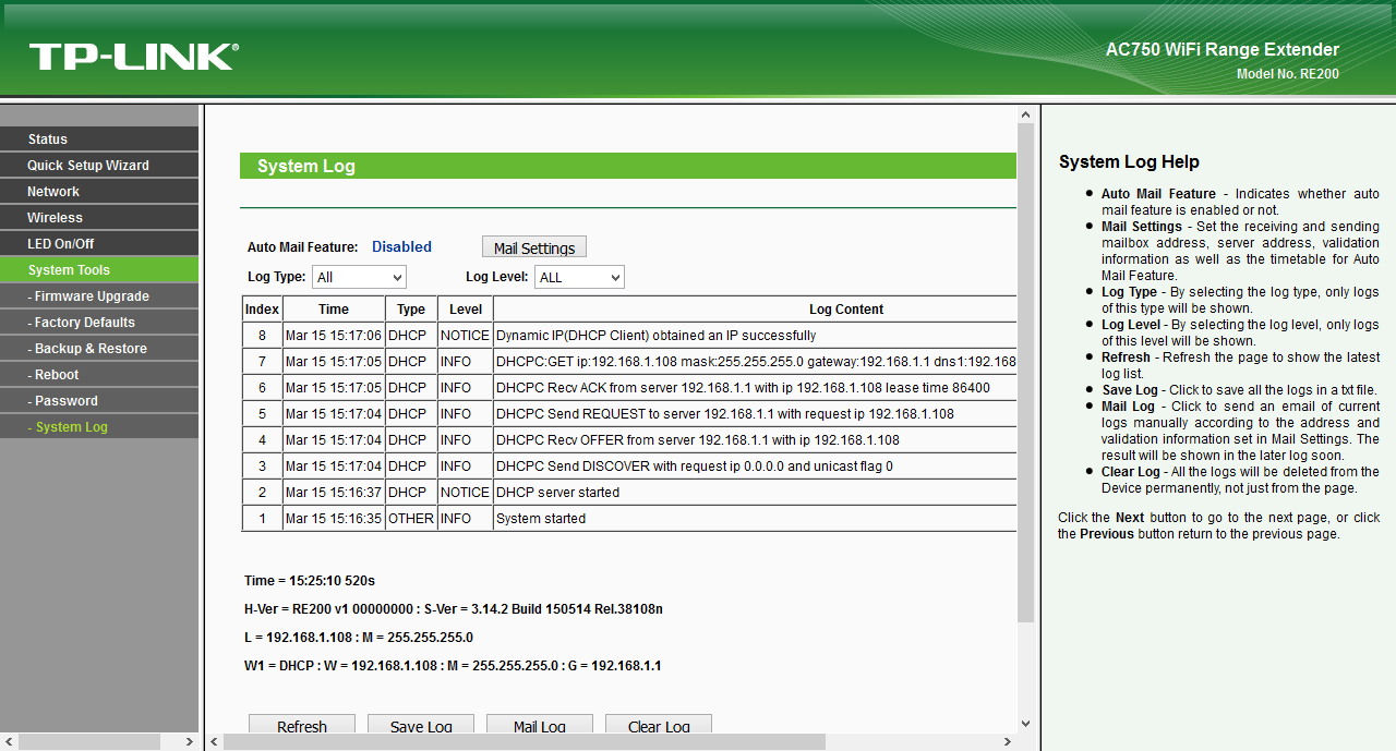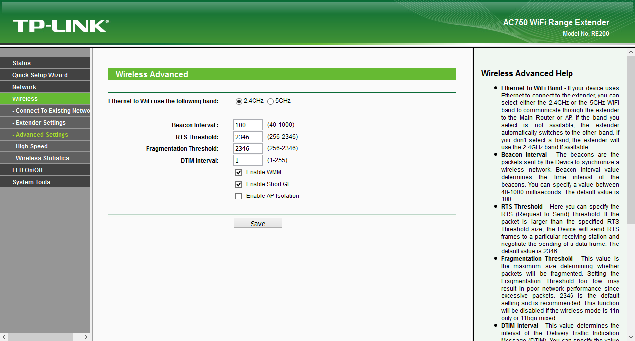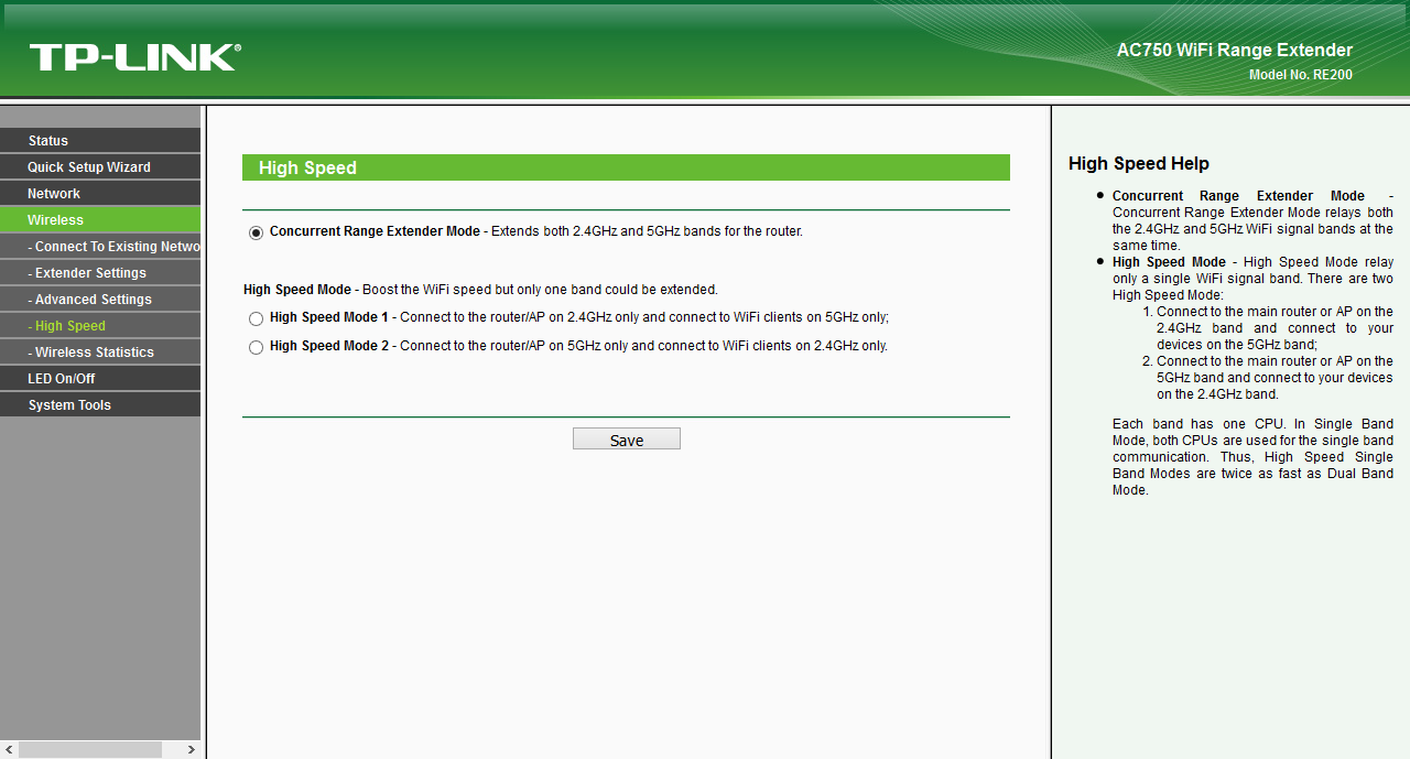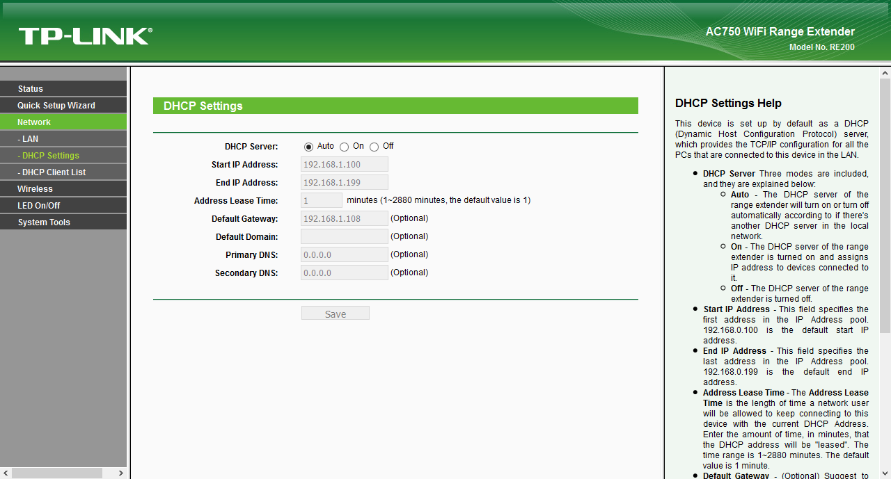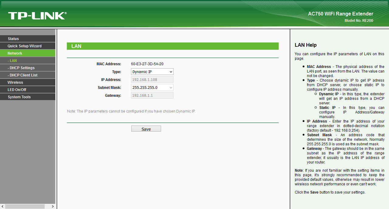 Отметим, что повторитель в этом режиме получает IP-адрес от основного роутера, так что при необходимости вы можете обратиться к его веб-интерфейсу для изменения параметров. Дизайн у него стандартный для данного производителя — дерево меню слева и справочная информация в правой колонке. А вот язык есть только английский. Заметим, что для активации многих параметров потребуется перезагрузка устройства, но в данном случае это не является существенным недостатком.