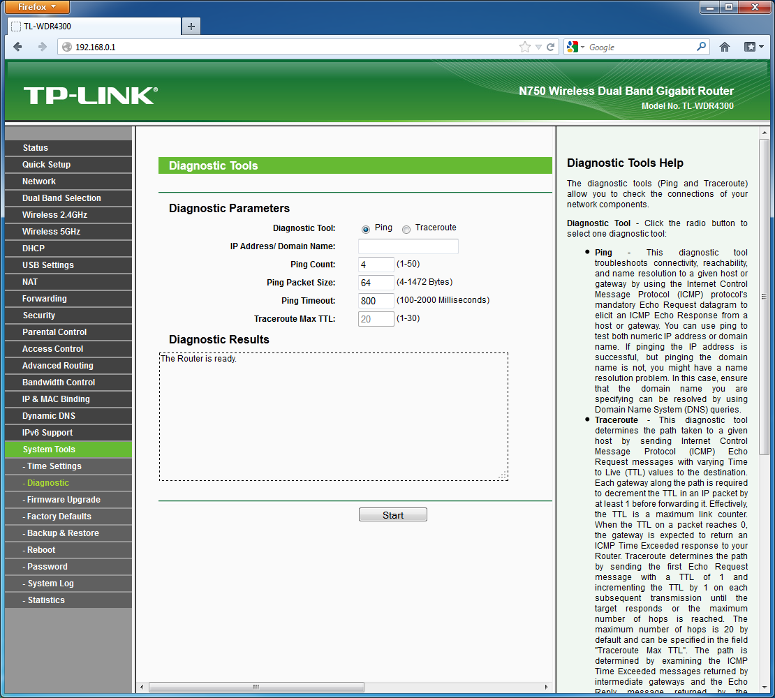 Системные настройки включают в себя установку часов, обновление прошивки, изменение пароля администратора, сохранение/восстановление/сброс конфигурации. Предусмотрены утилиты ping и traceroute для диагностики соединения, а также удаленная перезагрузка устройства. Роутер ведет обычный системный журнал. Есть возможность настроить регулярную отправку его по электронной почте.